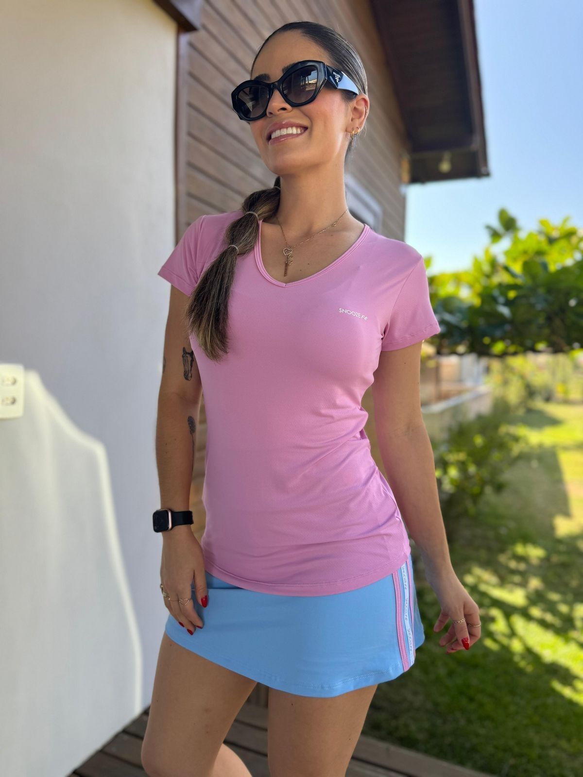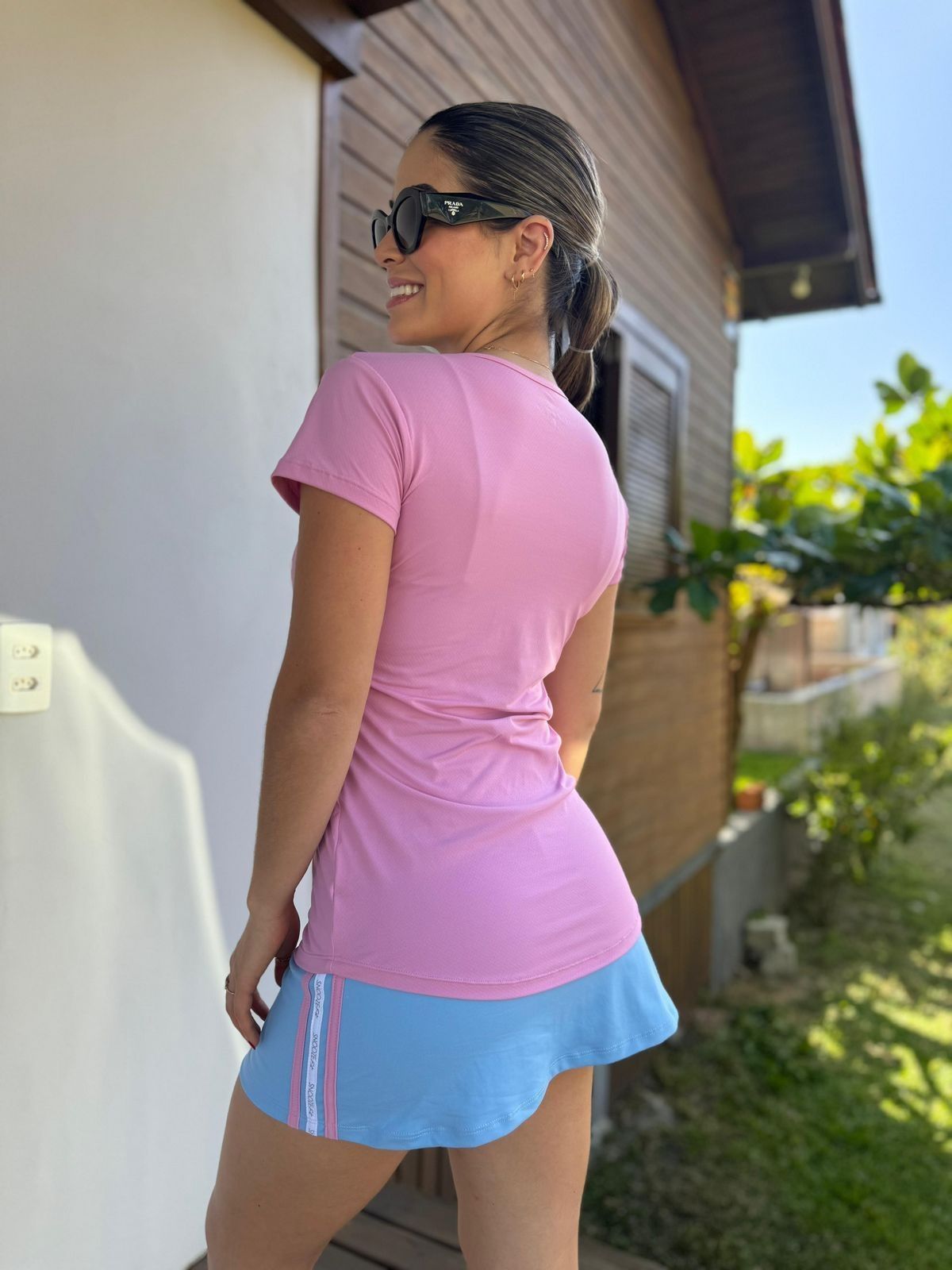 A modelo usa tamanho P