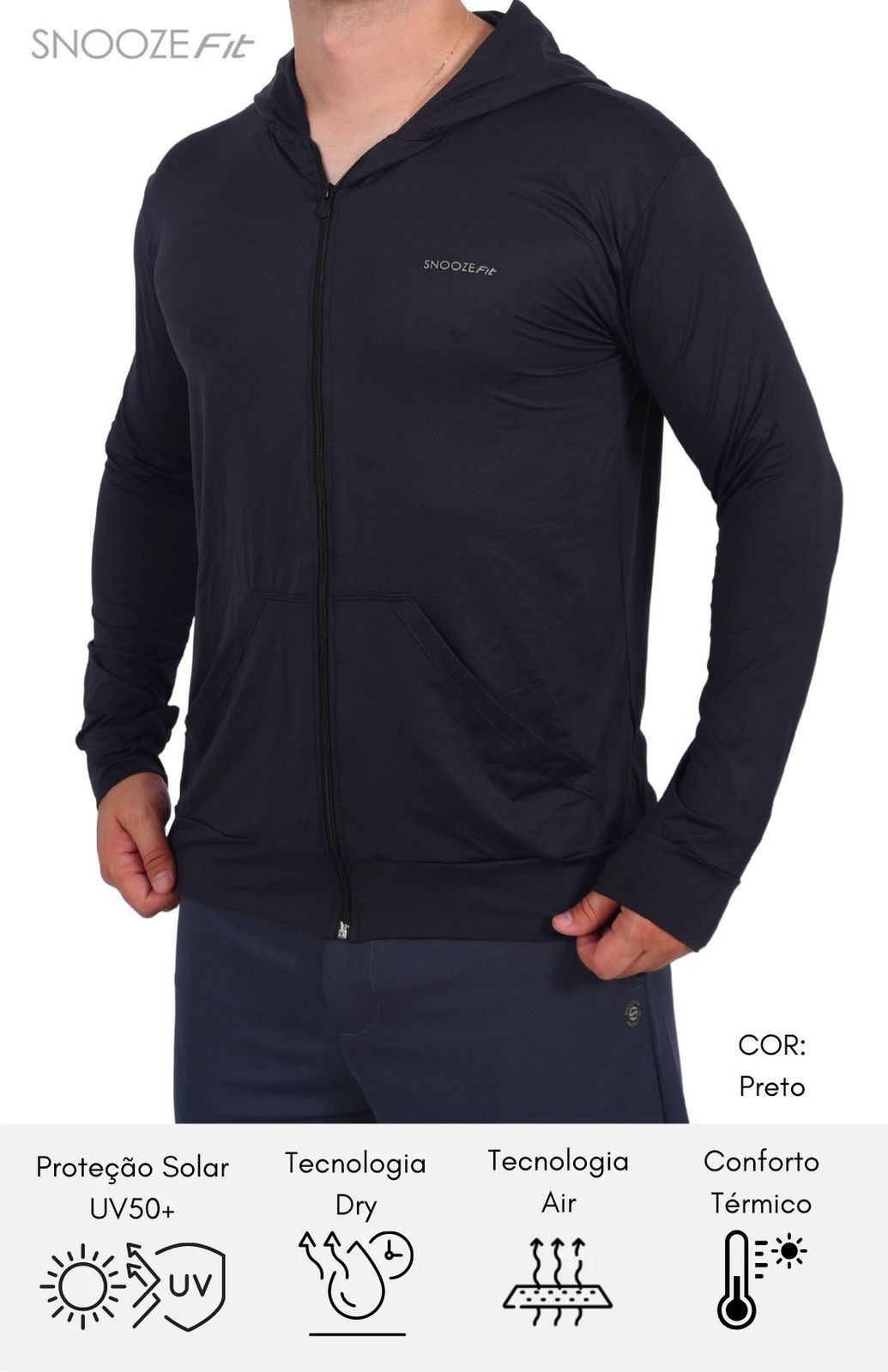 A Jaqueta Masculina Dry UV50+ é confeccionada em tecidos de poliamida com elastano, que proporciona toque gelado e macio, oferecendo também a proteção UV50+ contra os raios ultra violeta.