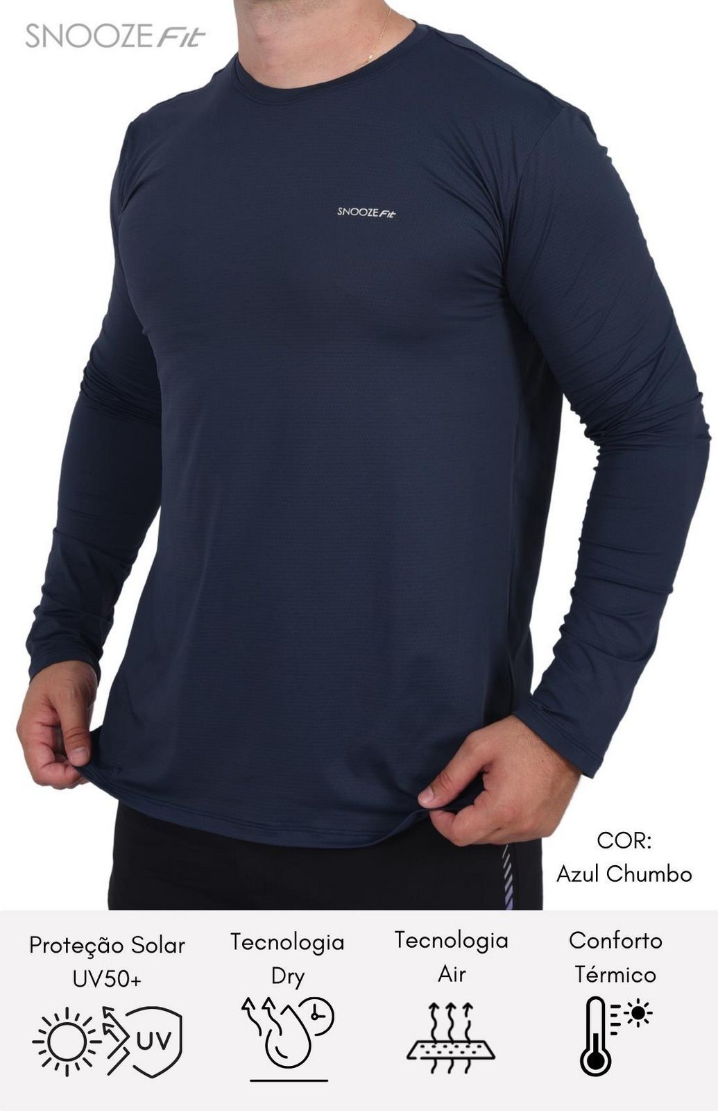 A Camiseta Dry Masculina Manga Longa é confeccionada em tecido de poliamida que proporciona além do toque gelado e suave, oferece proteção solar e a rápida evaporação do suor.
