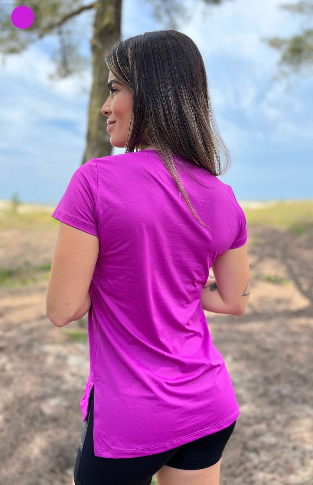 A Blusa Baby Look Tapa Bumbum New Colors possui modelagem exclusiva, com detalhe alongado na parte de trás e abertura lateral.