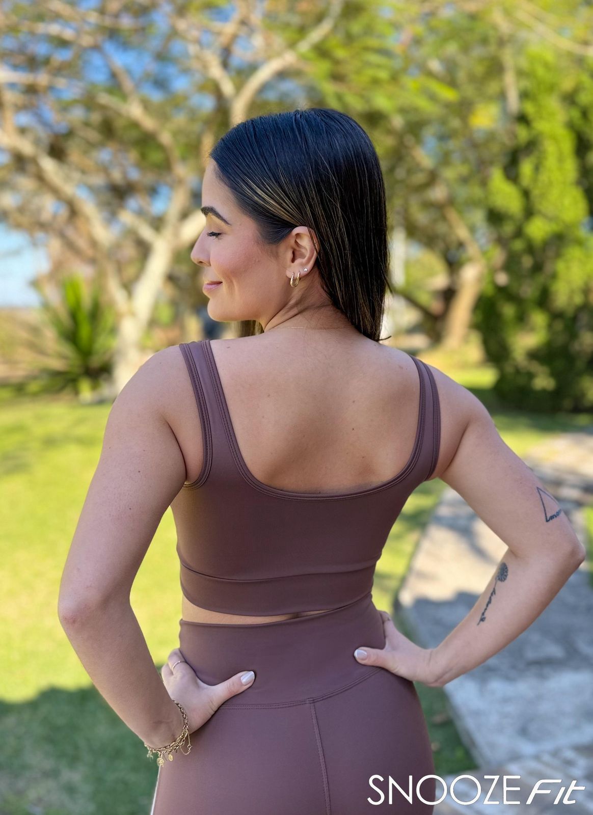 O Top Wood possui modelagem tipo regata com as costas mais cavada.